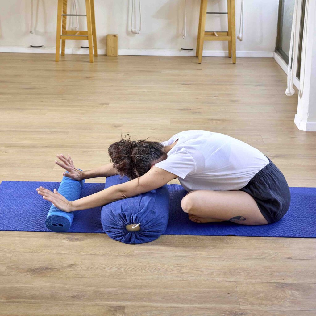 - מה עושים: שכיבה על בולסטר המונח לאורך הגב, שמיכה תחת הראש (למניעת הטיית הראש לאחור – קריטי להרגעת המוח), רצועה המהדקת את הרגליים קרוב לאגן ללא מאמץ, ובלוקים מתחת לירכיים למניעת כיווץ במפשעות.