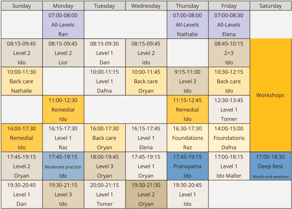 Our classes are divided according to students' experience levels and include a therapeutic track with classes adapted for practicing with limitations.